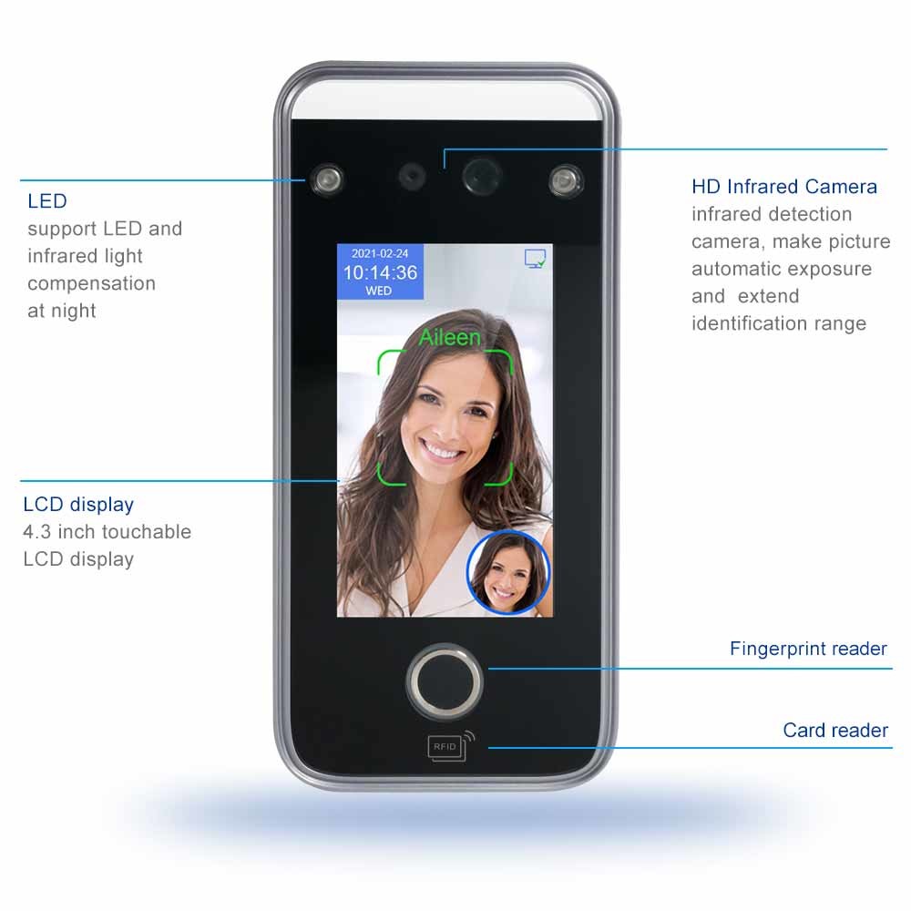 صفحه نمایش لمسی 5 اینچی IPS HD، وضوح صفحه: 1280*720.تشخیص چهره پویا، کارت rfid/ic کارت اختیاری است، رمز عبور پشتیبانی، چهره به عنوان شناسایی.